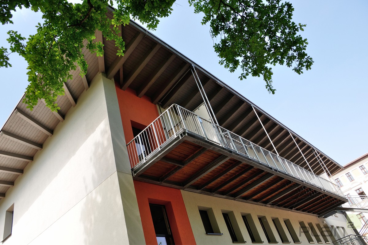 - Errichtung eines Laubenganges am 2. OG, abgehängt von der Holzsparrendachkonstruktion